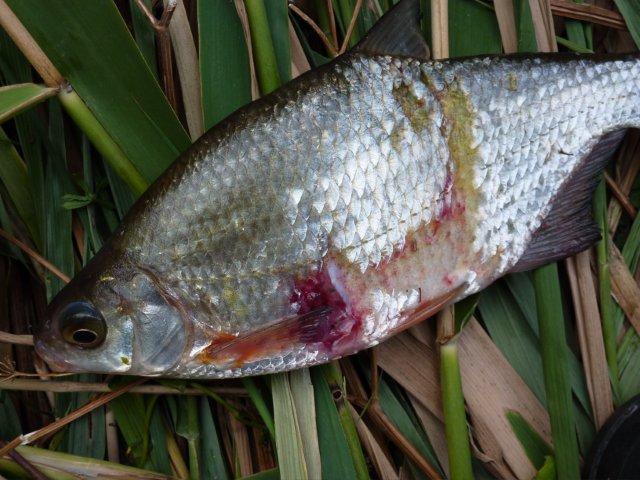 This badly damaged Wensum roach probably won’t survive