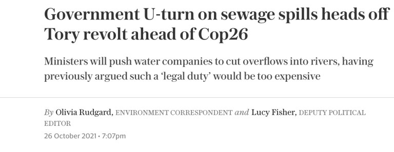 Spare a thought for loyal government backbenchers trying to explain their decision to obey the party whips and vote down last week’s Lords Amendment to require water companies to take action to end storm discharges of untreated sewage into the rivers and waterways so beloved by their constituents. This morning they wake up to the news that they are now expected to perform very public political contortions in a collective U Turn and vote for a new government amendment which is, according to last night’s DEFRA press release – “very similar to Amendment 45 in the name of the Duke of Wellington, which was debated in the House of Commons on Tuesday.”