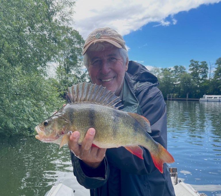 As July approaches I begin to think about getting the boat out on the Thames and having a go for some of the monster perch that live in my favourite river. This year I was asked by John Bailey to help out with a forthcoming episode of the wonderful Gone Fishing programme featuring Angling Trust Ambassador Paul Whitehouse and his irrepressible companion Bob Mortimer. I don’t want to give too much away but our local weirpools are cracking early season spots and it didn’t take long for me to get two lovely perch an ounce or two either side of the magic 3lbs mark. As mine was purely an off camera advisory role I can show them off here but you’ll have to wait until the show is broadcast in the autumn to see how Bob and Paul get on.