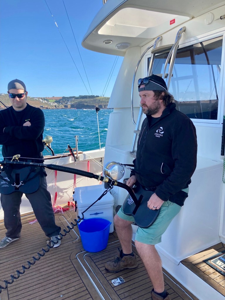 Angling Trust CEO Jamie Cook (right) and friend Tim Harris getting a quick lesson in how to play big tuna from a harness