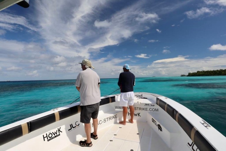 We found the yellowfin tuna on occasion either by trolling or casting at bust ups but they didn’t seem to be about in numbers. We brought fly rods and light soft plastic outfits to try for bonefish and other smaller species from the shore and although we had great fun casting from a couple of idyllic tropical islands we caught everything except bones. Typically, on the final day we got a better sense of the potential of this wonderful atoll. All the rods were packed away and we had an hour to kill before the boat came to take us across to the domestic airport for the onward flight back to Male. Adrian, Malcolm myself went exploring and at the far end of the island we found a gorgeous flat with the tide running in from the open ocean beyond. If anywhere had to hold bonefish this was it. And sure enough, within five minutes, we spotted some large pods of ‘grey ghosts’ patrolling the skinny water in search of a meal. Catching them would have been pretty straight forward as these were unpressured fish. If only we hadn’t run out of time. Worse was to follow as on the 45 minute boat ride back across the atoll we were twice within touching distance of two of the biggest tuna bust ups I have ever seen. The sky was black with birds as the yellowfin created carnage smashing into what must have been huge shoals of bait fish. All we could do is look wistfully at the rods resting uselessly in their tubes and think about a return trip to do the place justice.