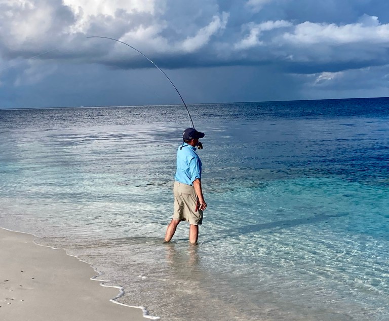 The Maldives offers an amazing variety of angling opportunities and locations from uninhabited islands, ocean facing reefs and sandy shores from which Malcolm was targeting small Trevally on the fly